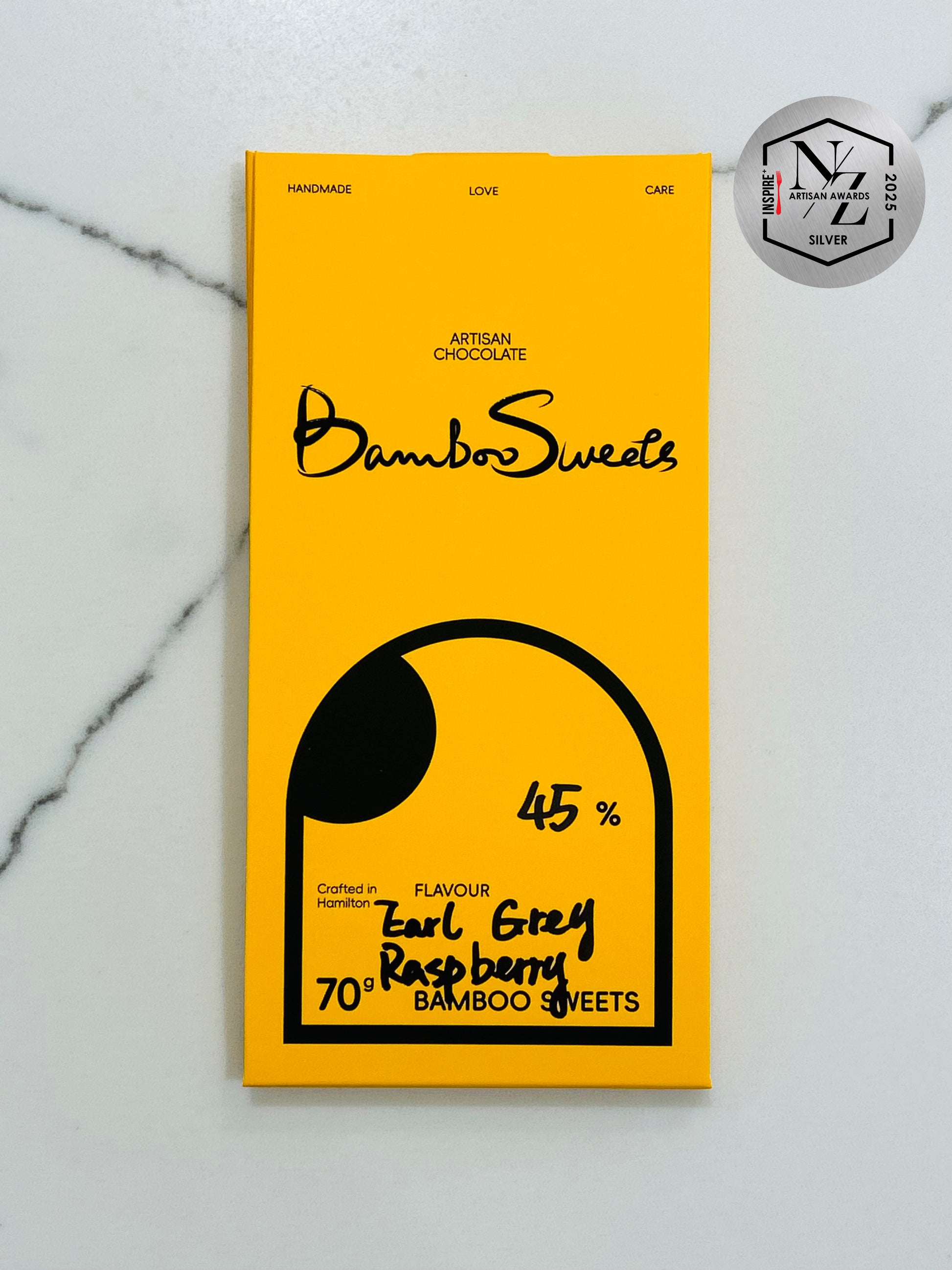 This silky 45% milk chocolate is delicately infused with the floral citrus notes of Earl Grey tea, creating a refined base with gentle depth. Bright bursts of real raspberry add a tangy lift, balancing the sweetness with a touch of tart sophistication. A smooth, comforting chocolate with a modern twist — perfect for afternoon indulgence.